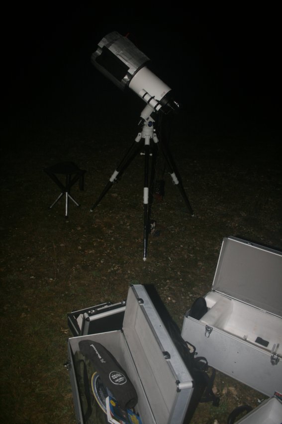 Die Kamera ist eine Canon EOS 400D, die ich entweder mit besagtem Halter befestige, oder aber mit einem Kameraadapter direkt an das Teleskop anschließe. Die Kisten im Vordergrund sind aus dem Baumarkt, die ich mit Holz und Styropor in Fächer unterteilt und dann mit weicher Kunststofffolie (Trittschalldämmung für Parkett aus dem Baumarkt) ausgelegt habe. |
